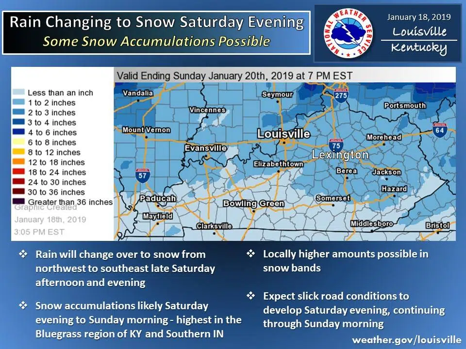 Rain will change to snow Saturday afternoon into Saturday night. Accumulations of 1 to 2 inches, with locally higher amounts upwards to 3 inches possible, are expected mainly north of the Ohio river, with generally less than 1-inch amounts across the south.