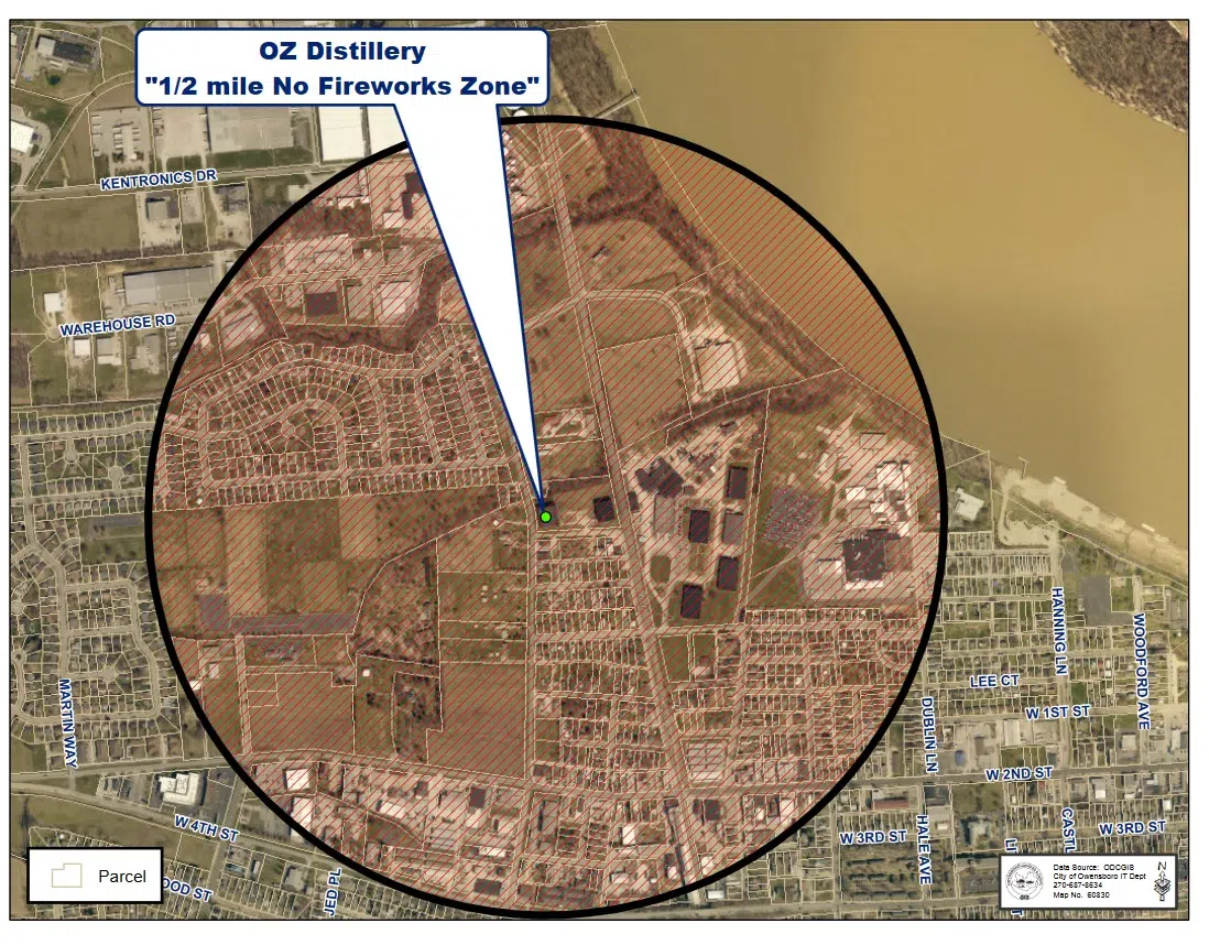 By authority of State Statutes, appropriate Fire Code and City Ordinances, Owensboro Fire Chief Steve Mitchell has issued a Fireworks Restriction in the designated area so mapped as attached. This area is within 1/2 mile of the damaged OZ Tyler Rick House.