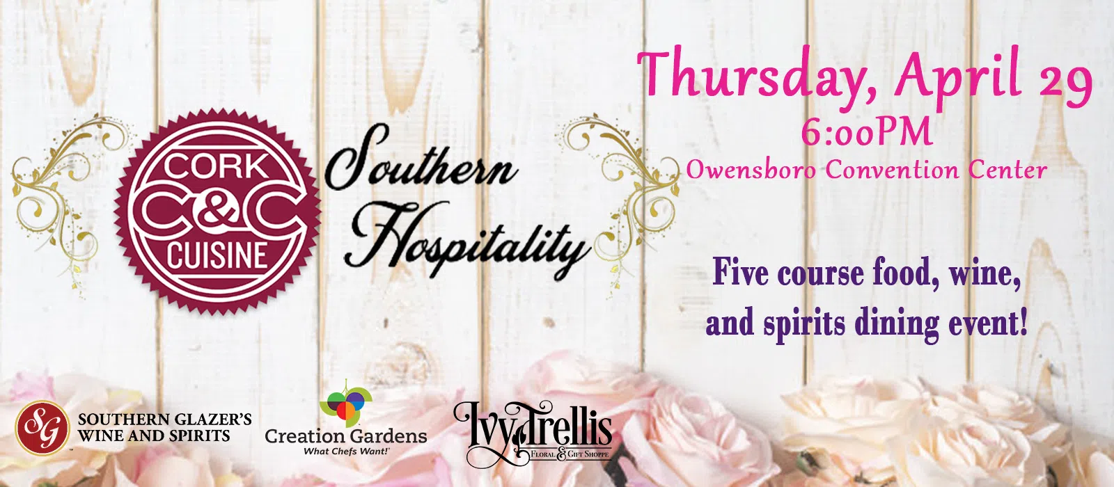 Owensboro, KY (March 18, 2021) – Spectra, the providers of Venue Management to the Owensboro Convention Center, invites food and wine lovers to come on by and stay a while! Cork & Cuisine, Southern Hospitality will be Thursday, April 29 at 6:00PM.