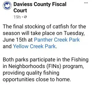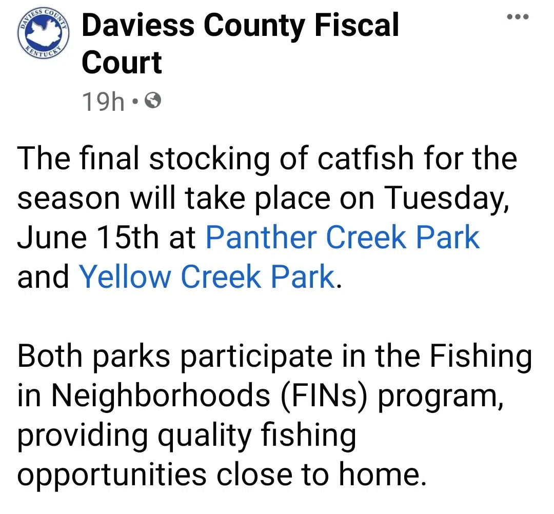 The Daviess County Fiscal Court announced the final stocking of catfish will take place on Tuesday, June 15th for Panther Creek Park and Yellow Creek Park. This will be the final stocking of catfish for the season.