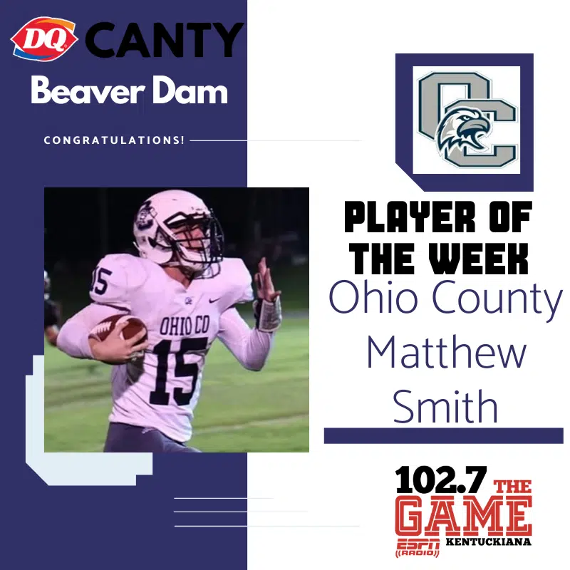 Ohio County junior Matthew Smith has been named the ESPN Owensboro Ohio County Eagle of the week brought to you by Canty Dairy Queen in Beaver Dam. Stop in Dairy Queen in Beaver Dam today for the fall blizzard menu featuring Sea Salt Toffee Fudge, Reese’s Piece’s Cookie Dough, Oreo Mocha Fudge, Choco Dipped Strawberry, and Royal Ultimate Choco Brownie. Canty Dairy Queen is also offering a $100 bonus after 60 days of work. Apply now at: https://cantyjobs.com/?fbclid=IwAR2iOC8Zp-5PiIehFNFAjWaR-P9tx6SDW9puMAJYD20KguYYK3mg6Z_Loug