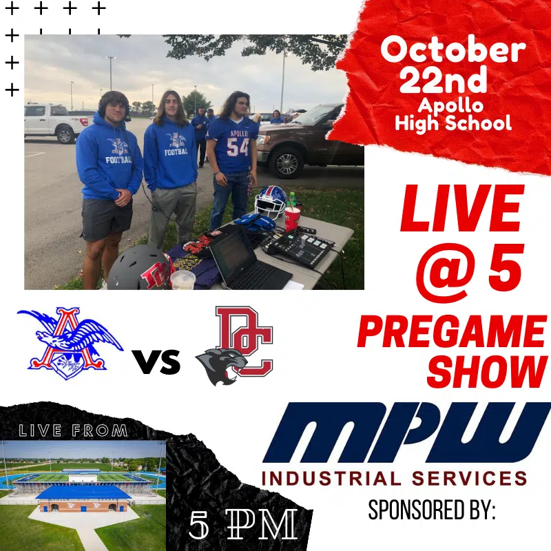 Live at 5 Pregame Show is brought to you by MPW Services as Steve, Vic, and David are on location at Apollo High School. Christian Combs, Dayton Brow, & Kadin Howard talk about the Eagle’s season and the upcoming Daviess County game. Allen Masterson from MPW joins the guys to talk about the game & happenings at MPW. The guys break down the local games and make predictions courtesy of Foreman, Watson, Holtrey.
