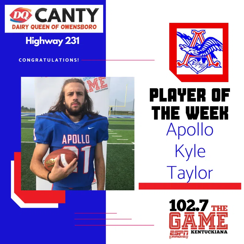 Taylor, a senior defensive back, racked up 7 tackles and 1 interception in Apollo’s game against Daviess County on Friday. For the season, Taylor has 33 tackles, 6 tackles for loss, 2 interceptions, and 1 interception for touchdown. Apollo will host Greenwood this Thursday at 7pm. You can listen as David Clark and Vic Evans have the call on 102.7 The Game ESPN Owensboro brought to you by Owensboro Health!