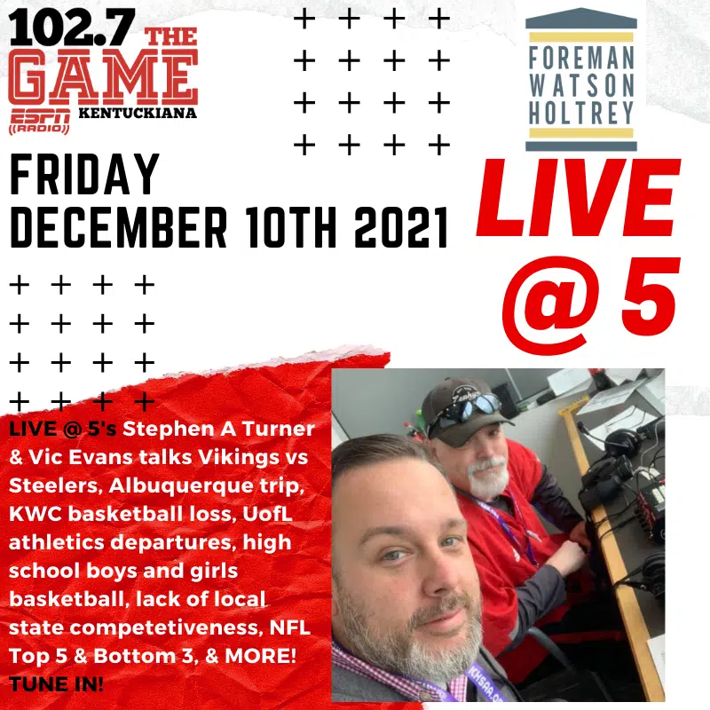 Live at 5 is brought to you by Foreman, Watson, Holtrey as Stephen A Turner and Vic Evans talk Vikings vs Steelers, Steve’s Albuquerque work trip, KWC basketball loss, UofL athletics departure, high school boys and girls basketball, lack of local competitiveness statewide in local sports, NFL Top 5 & Bottom 3, Joe Humphreys coaches Mr. Football snub, and MORE!