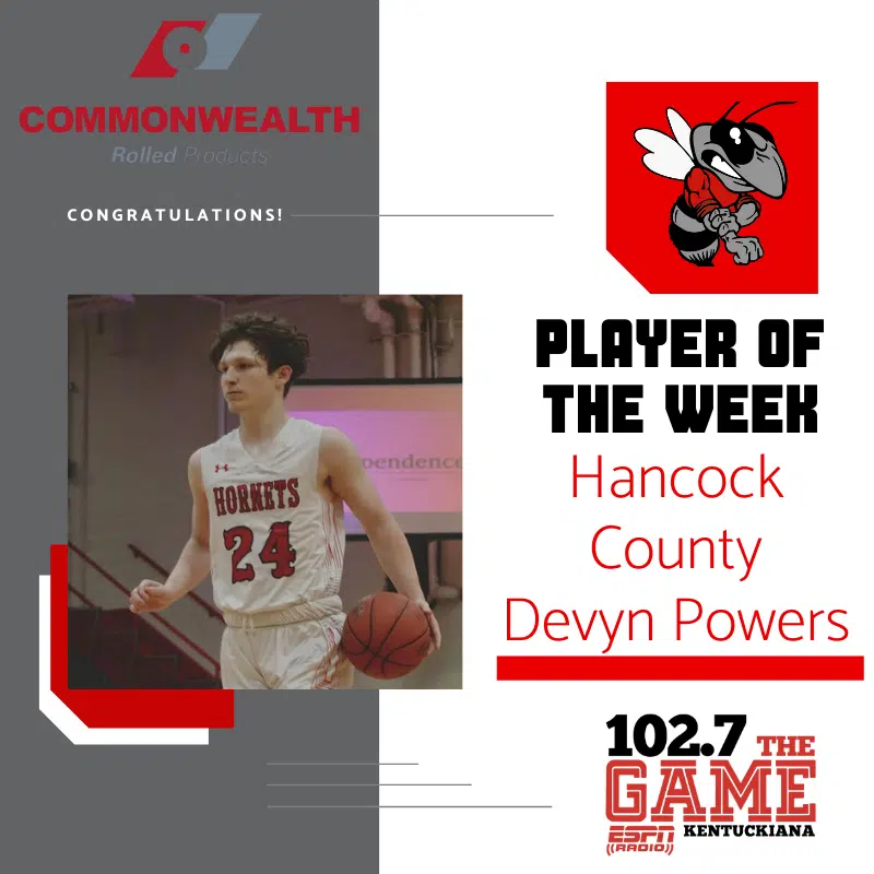 Powers, a junior guard, has averaged 15 points per game over the past two weeks for the Hornets. He scored 24 points in Hancock County’s 64-44 win over Dawson Springs. For the season, Powers is averaging a team best 15.8 points per game, while shooting 49% from the field and 40% from the 3 point line.