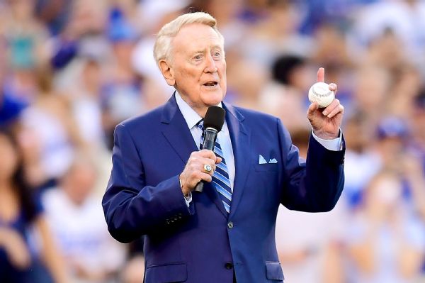 The Los Angeles Dodgers will wear a uniform patch featuring a microphone and “Vin” in honor of legendary broadcaster Vin Scully, who died Tuesday at 94.