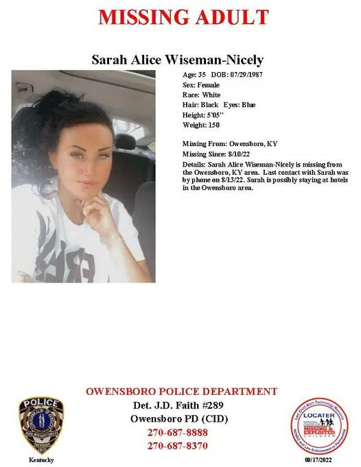 Owensboro police are looking for a woman who has not been heard from since Saturday. Sarah Alice Wiseman-Nicely was last contacted by phone and police believe she may be staying in hotels around Owensboro. She was last seen on August 10th and officials are urging anyone with information on the 35-year-old’s whereabouts to come forward. Wiseman-Nicely is five-foot-five with black hair and blue eyes.