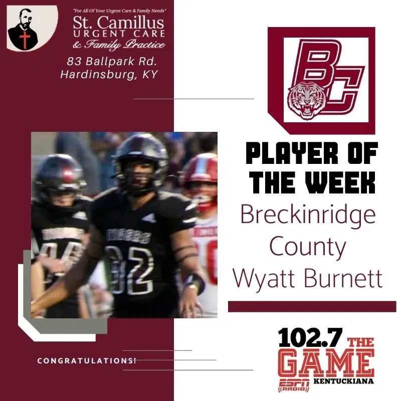 Wyatt Burnett has been named the ESPN Owensboro Breckinridge County Fighting Tiger of the week brought to you by Saint Camillus Urgent Care in Hardinsburg. The Saint Camillus team can treat injuries, administer flu shots, perform minor surgeries, complete routine screenings, diagnose and treat minor illness, conduct sports and school physicals, and provide occupational medical servics. Visit saintcamillusurgentcare.com to learn more!