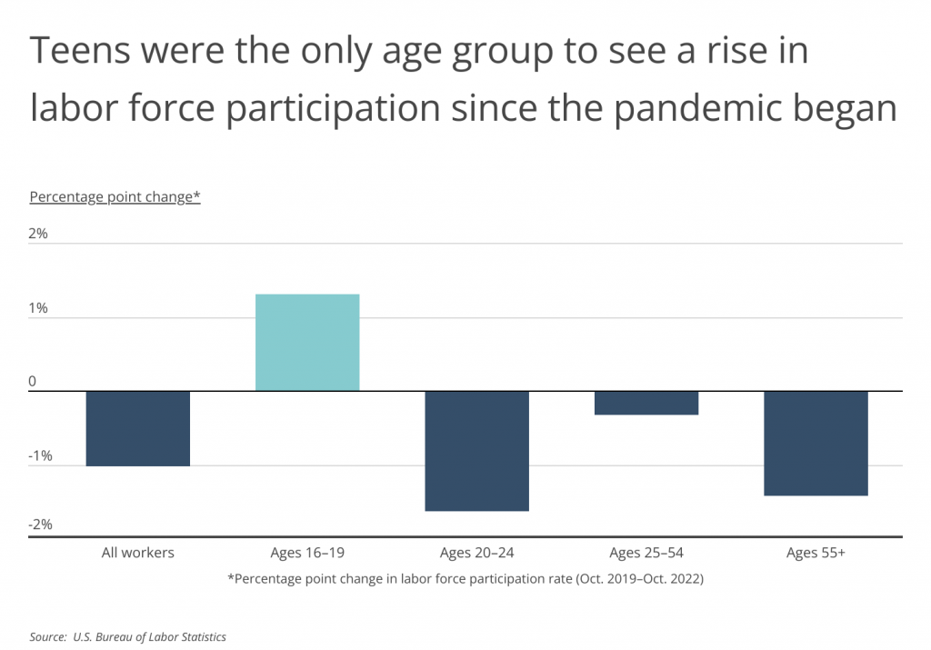While labor force participation across all workers remains about a percentage point lower today than it was immediately before the pandemic, teen labor force participation is actually up by 1.3 percentage points, according to data from the U.S. Bureau of Labor Statistics. In fact, teens were the only age group to see a rise in labor force participation during the pandemic.