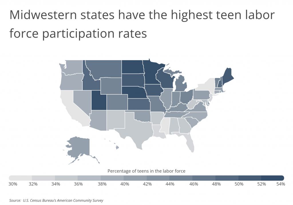 The data referenced below is from the U.S. Census Bureau. To determine the locations with the most working teens, researchers at Smartest Dollar calculated the percentage of teens in the labor force. In the event of a tie, the location with the greater total number of teens in the labor force was ranked higher. For school enrollment, teens were defined as those between ages 15–19, but for labor force participation, teens were defined as those between ages 16–19.