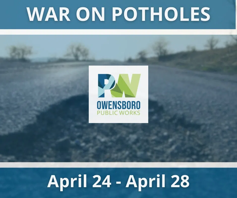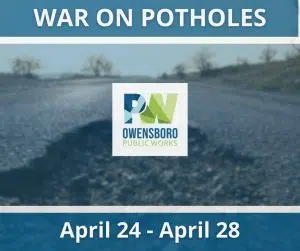 In order to fill potholes created during the winter freeze cycle, the Owensboro Street Department has declared a ‘WAR ON POTHOLES’. During the week of April 24 – April 28, the public is asked to report the location of potholes to City Action at 270-687-4444 or email: cityaction@owensboro.org.