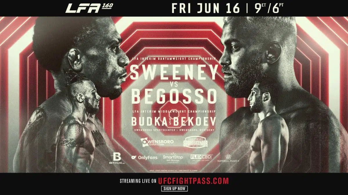 LFA CEO Ed Soares announced details Thursday about the promotion’s debut event in Kentucky. The main event and co-main event of LFA 160 will feature a pair of interim title fights in the bantamweight and middleweight divisions. These interim opportunities became available as the promotion awaits the return of its sitting champions. LFA 160 will be the first LFA event to take place in the Bluegrass State. This will also be the twenty-eighth state that the promotion has visited. It happens Friday, June 16th at the Owensboro Sportscenter. The main event will feature an interim bantamweight title fight between top contenders John “Hollywood” Sweeney and Allan “Mini” Begosso. Then in the co-main event, Dylan “The Mindless Hulk” Budka meets Azamat “Kingpin” Bekoev for the interim middleweight title. The entire main card will be available worldwide on UFC FIGHT PASS® at 9 p.m. ET / 6 p.m. PT. Tickets for LFA 160: Sweeney vs. Begosso are available for purchase now through OwensboroTickets.com.