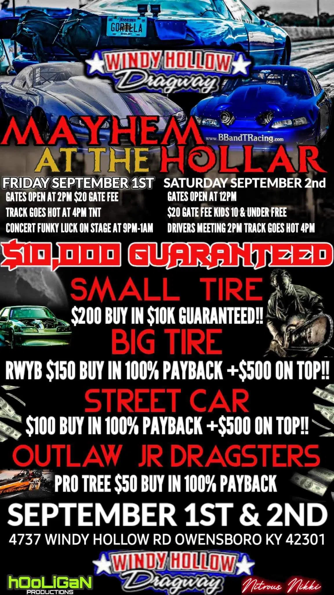 Friday’s events were in preparation for Saturday’s “Mayhem at the Hollar” heads up racing event that will include a guaranteed purse of $10,000 to the Winner. Classes include Small Tire, Big Tire, Street Car and an Outlaw Junior Dragster Class.