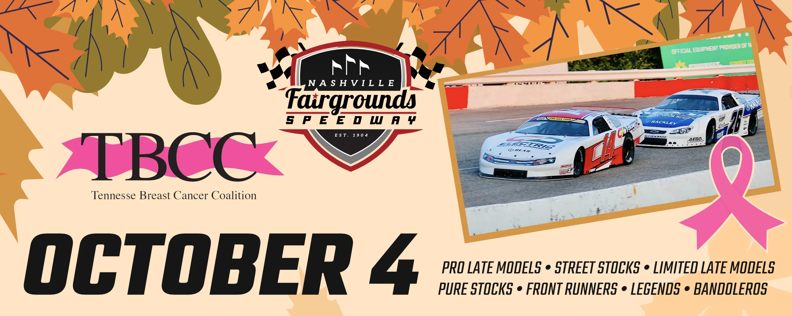NASHVILLE, TN (September 26, 2025) — With only two race weekends remaining in the 2025 season, excitement is building for Breast Cancer Awareness Night at Nashville Fairgrounds Speedway, coming up on Saturday, October 4. Partnering together with Tennessee Breast Cancer Coalition to raise awareness for screenings and resources. Headlined by a 100-lap feature for the Pro Late Models, the night promises high-speed thrills, racing for a cause and family fun.
