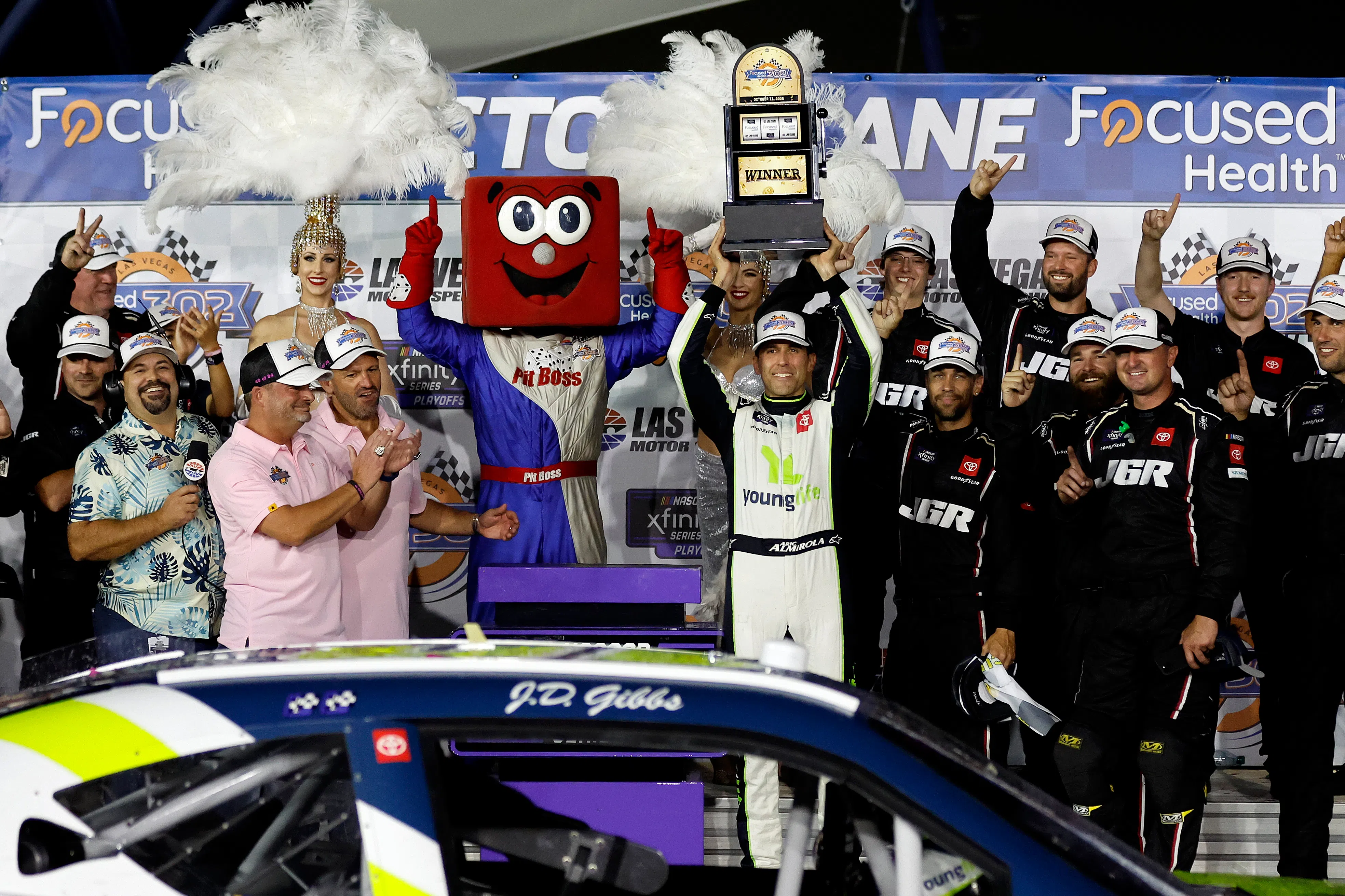 LAS VEGAS – An incredible race-long scramble among the day’s front-running trio of veteran Aric Almirola and young talents Connor Zilisch and Jesse Love ended in favor of the experienced Almirola, but he really had to earn this trophy in Saturday’s Focused Health 302 NASCAR Xfinity Series Playoff race at Las Vegas Motor Speedway.