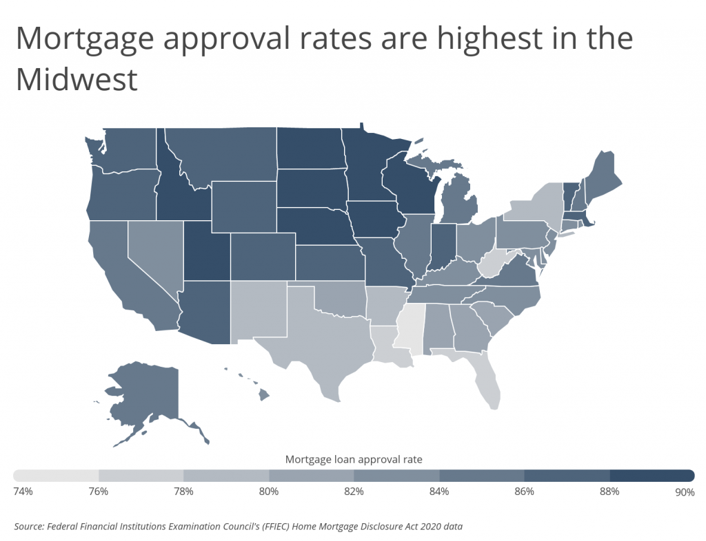 Approval rates are highest in the Midwest, while they tend to be lower in the South and Southeast. This is likely due to differences in local demographic makeup and socioeconomic status. At 90.6% and 90.1%, respectively, North Dakota and South Dakota residents experienced the highest loan approval rates in the country. At the other end of the spectrum, Mississippi and Florida residents faced the lowest loan approval rates, at just 74.7% and 77.1%, respectively.