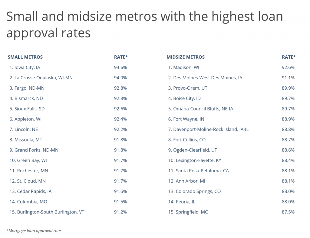 The small and midsize metros with the highest loan approval rates are also mostly spread across the Midwest and West. Loan approval rates in these cities are as high as 94%. Median home prices and median household income in some of these metros are lower than the national level; however, all of these metros have smaller-than-average minority populations.