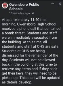 At approximately 11:40 this morning, Owensboro High School received a phone call that contained a bomb threat. Students and staff were immediately evacuated from the building. At this time, all students and staff at OHS are safe. Students at OHS are being dismissed for the remainder of the day. Students will not be allowed back in the building at this time to retrieve any items and if they can’t get their keys, they will need to be picked up. This post will be updated as details develop.