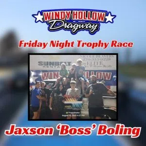 The weekend kicked off with ‘Friday Night Fun’ that included test-and-tune, grudge races and a trophy race to end the night. When the winning bulb lit, it was 13 year-old Jaxson ‘Boss’ Boling going to Windy Hollow Dragway victory lane with his baseball coach, and series points leader, Jerry Martin claiming runner-up in the Friday Night Trophy Race.