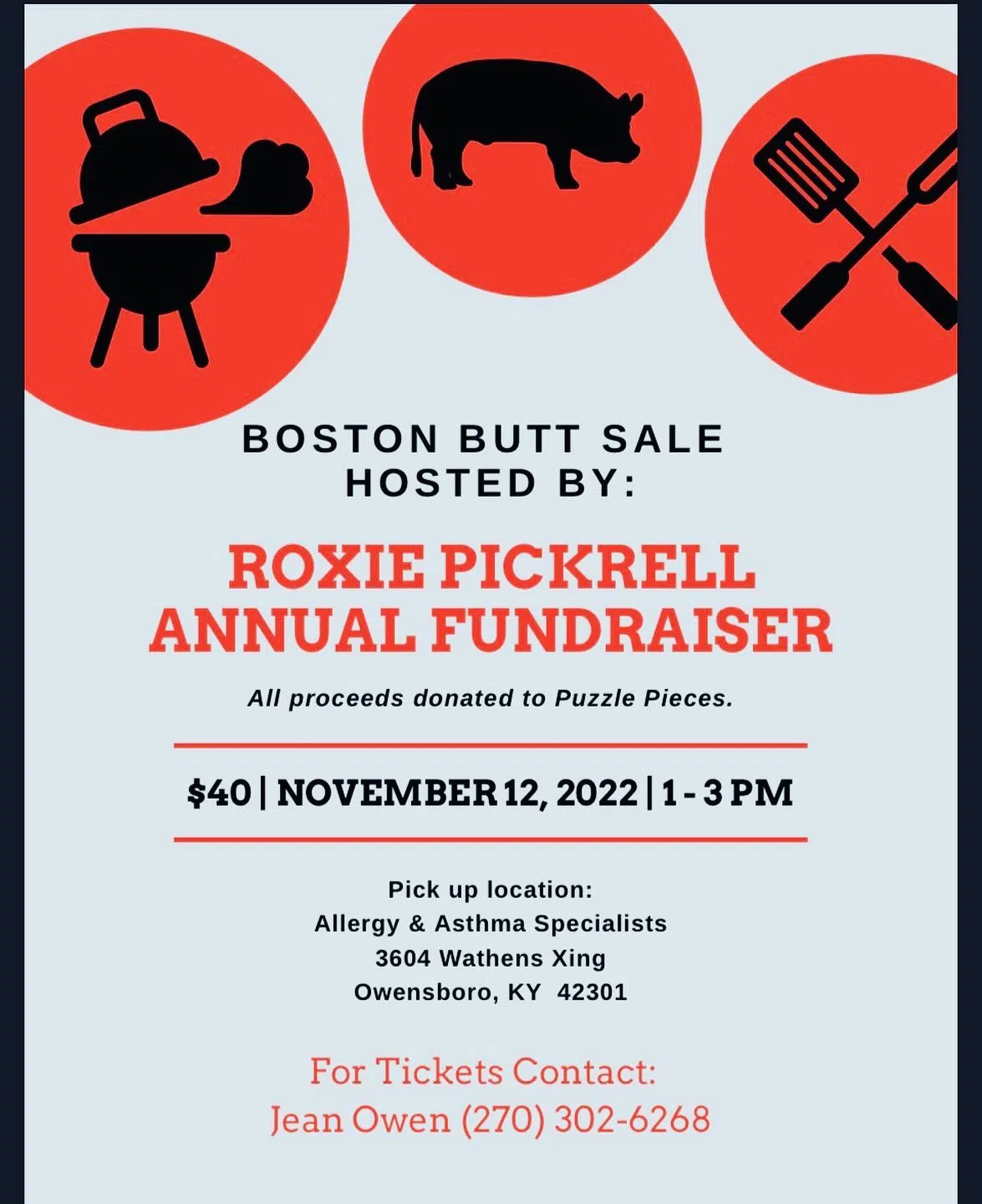 This is the 4th Annual Boston Butt Cook in memory of Roxanne Lorraine Pickrell. The butts are cooked by OFD fireman, Patrick Franey. Reserve your boston butt by contacting Jean Owen at 270-302-6268 or Cathy Pickrell at 270-316-1659. Proceeds will go to Puzzle Pieces in Roxanne's name. Pay in the form of cash, check (to Puzzle Pieces), or Venmo to @Cathy-Pickrell. Pick up is at Allergy and Asthma Specialists, 3604 Wathens Crossing, Owensboro, 42301 on 11/12/22 between 1 and 3pm.