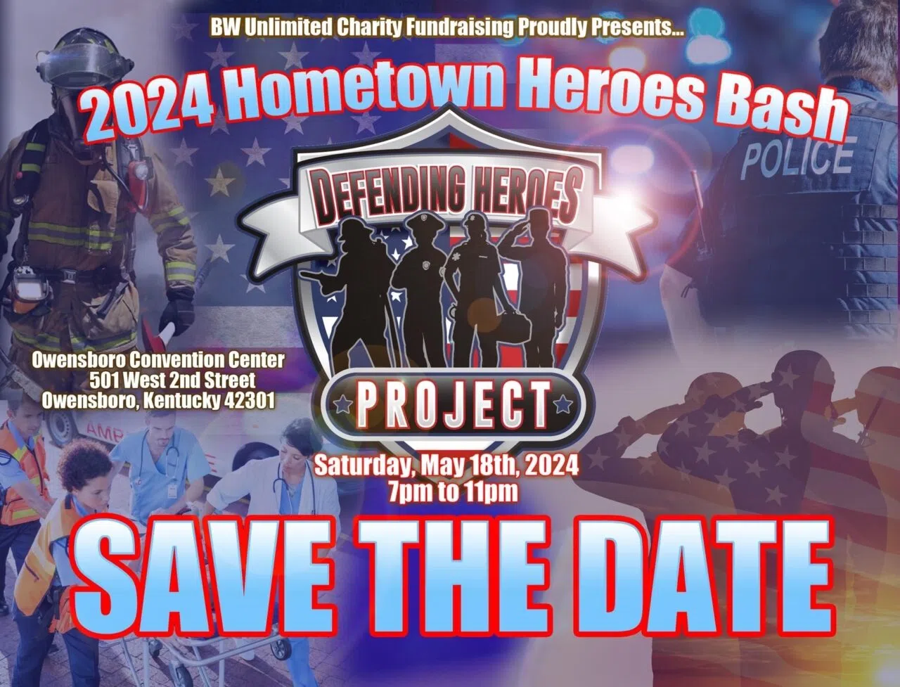 The Defending Heroes Project is proud and excited to announce the 2024 Hometown Heroes Bash coming to the Owensboro Kentucky Convention Center on Saturday, May 18 from 7pm to 11pm. 100% of the proceeds of this AMAZING event goes to the Defending Heroes Project, a 501(c) registered U.S. non-profit which helps First Responders and Veterans in their times of need.