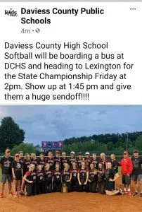 The Daviess County High School Ladies Softball team is heading to Lexington for the State Championship! Help send them off in a BIG WAY today at 1:45 p.m. at Daviess County High School. The bus leaves at 2:00 p.m.